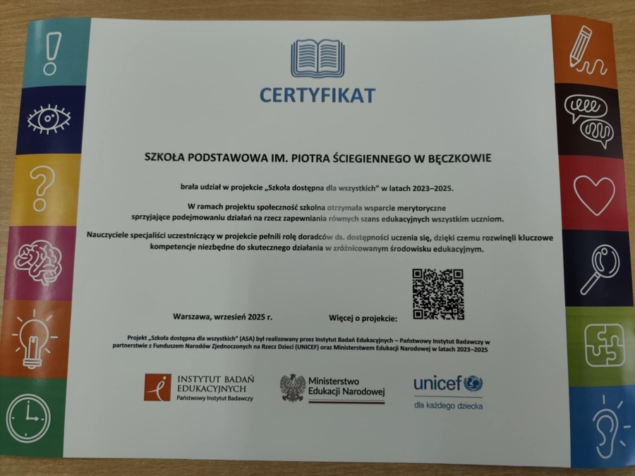 Bardzo miło mam poinformować, że nasza szkoła uzyskał Certyfikat kończący działania naszych nauczycieli specjalistów : pani Justyny Paweloszek oraz pani Ewy Pasek w projekcie " Szkoła dostępna dla wszystkich", który był realizowany przez Instytut Badań Edukacyjnych, Ministerstwo Edukacji Narodowej oraz UNICEF. W ramach działań projektowych nauczyciele uczestniczyli w wielu szkoleniach, rodzice i uczniowie mogli nieodpłatnie skorzystać z porad specjalistów, a szkoła dostała pomoce dydaktyczne. To sukces dla naszych nauczycieli, ponieważ rozwinęli kompetencje kluczowe w zakresie skutecznego działania w zróżnicowanym środowisku edukacyjnym oraz otrzymali odznaki Doradców Do Spraw Uczenia Się.